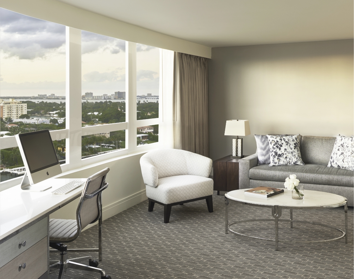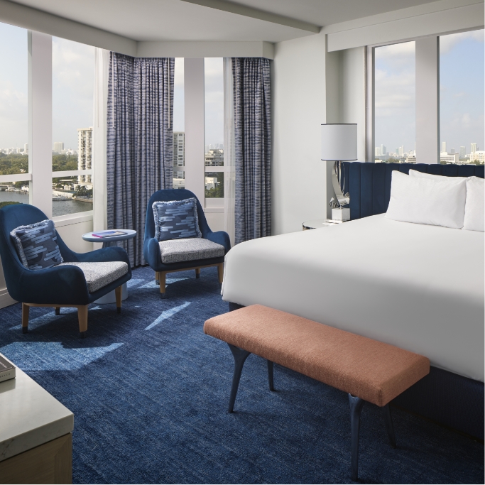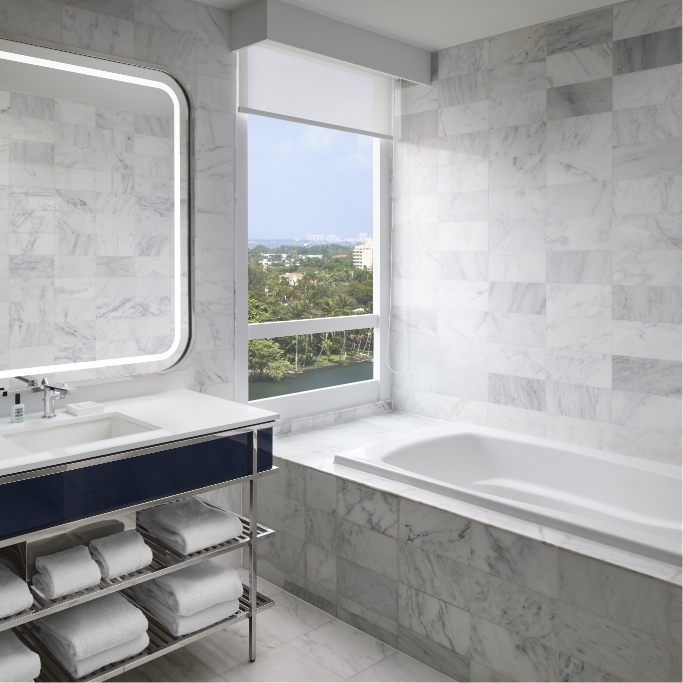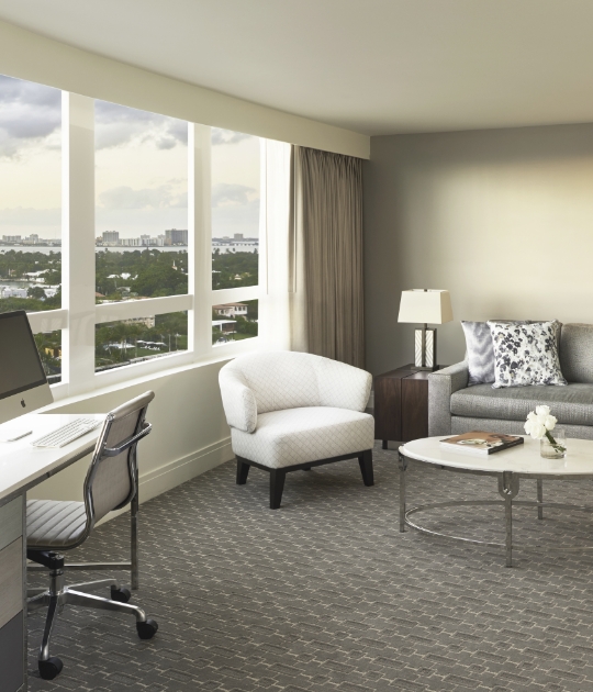 Stay in premium comfort, featuring a sitting area with sleeper sofa, marble bath and glass-enclosed walk-in shower. Beautiful views of Downtown Miami or Biscayne Bay invite you to explore.