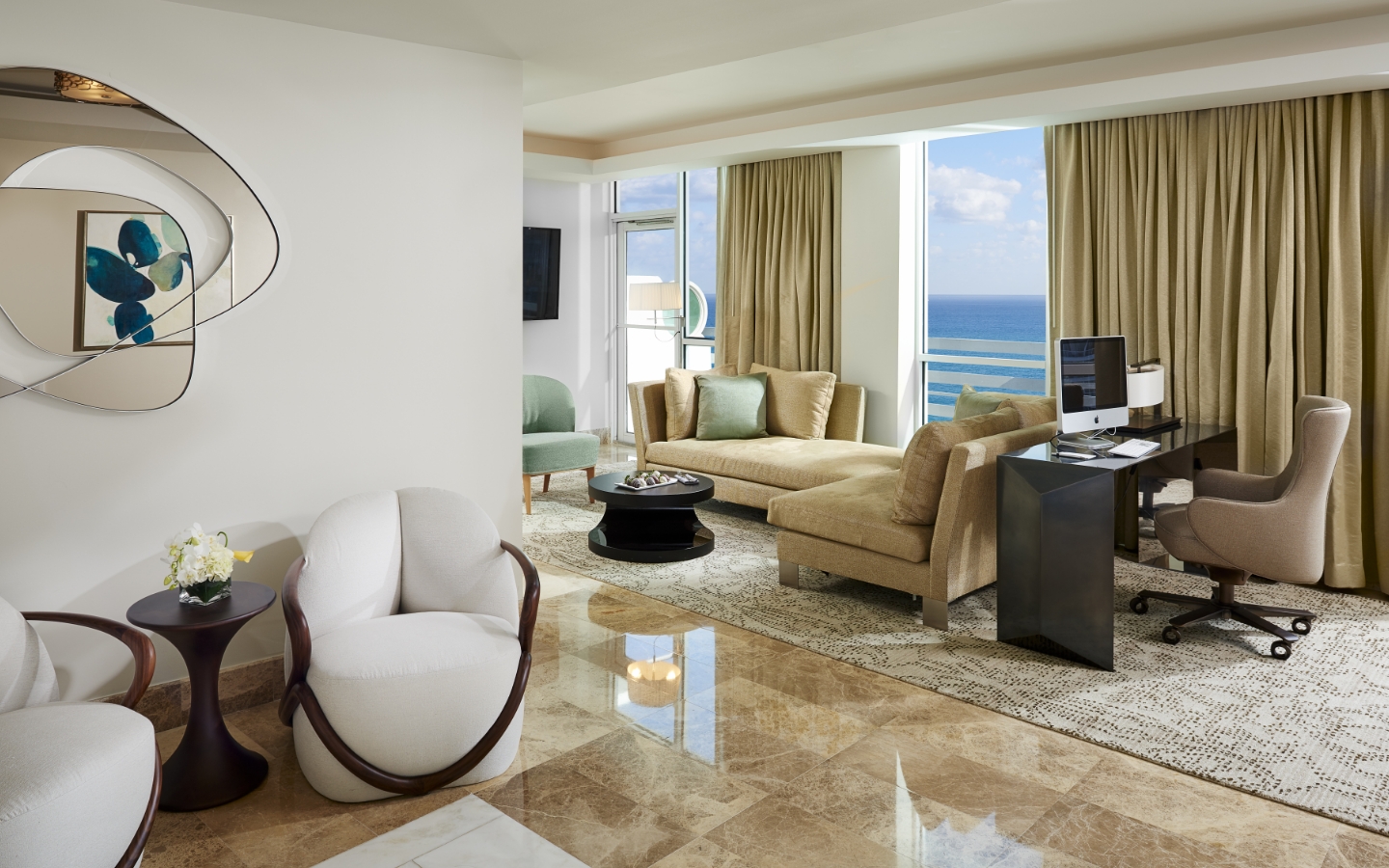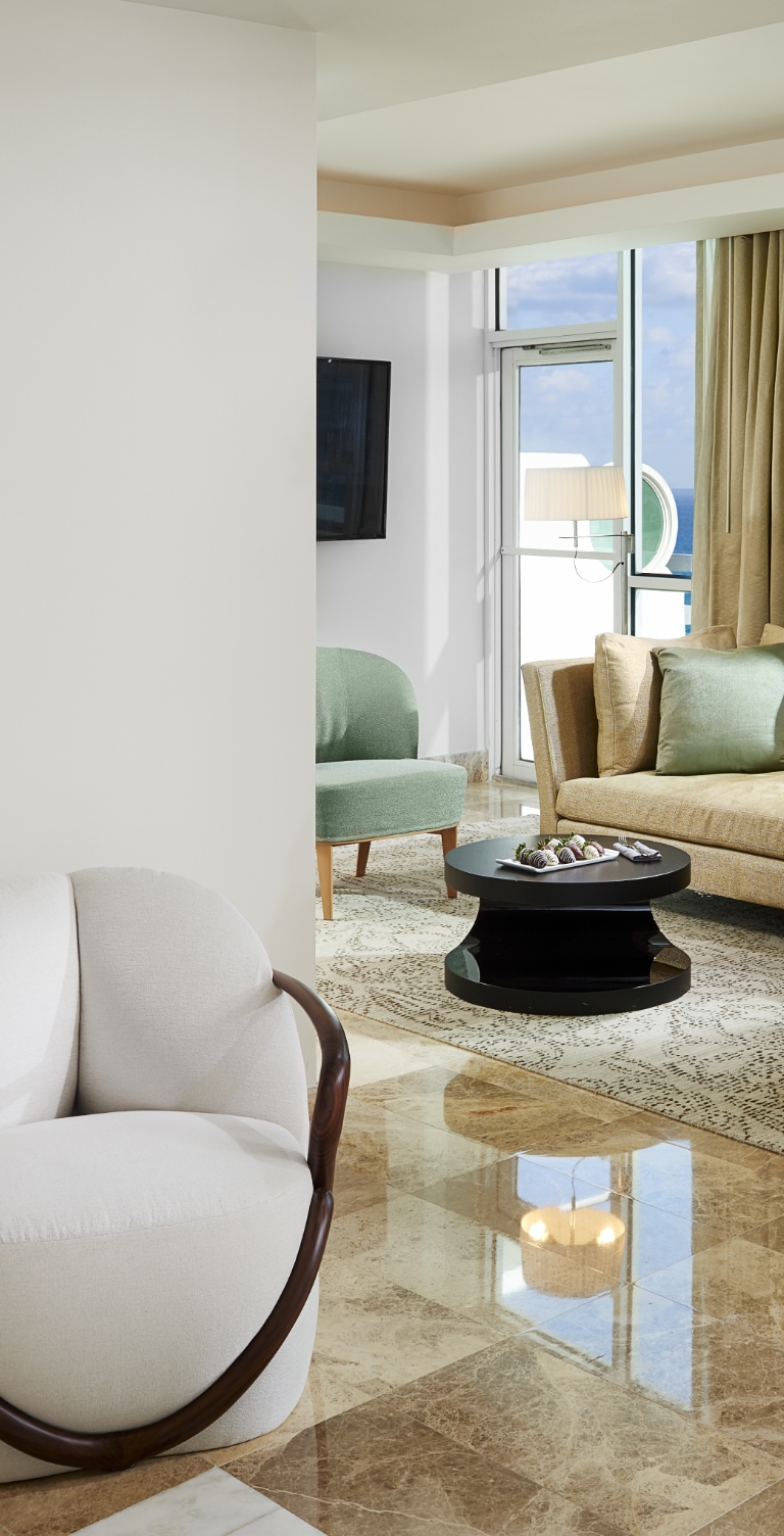 Gleaming with hand-selected marble throughout, you’ll find this 1,525 square foot private escape to be one of the most stunning two-bedroom suites in Miami. The sun-splashed living area and dining room feature a full-size wet bar leading out to a private wrap-around furnished balcony with panoramic views.