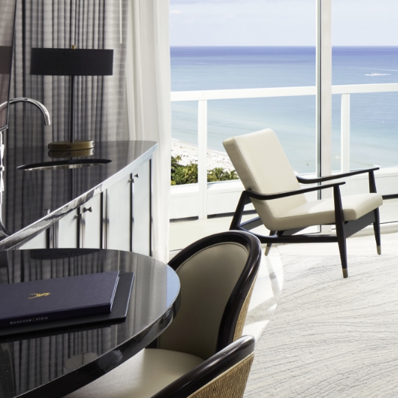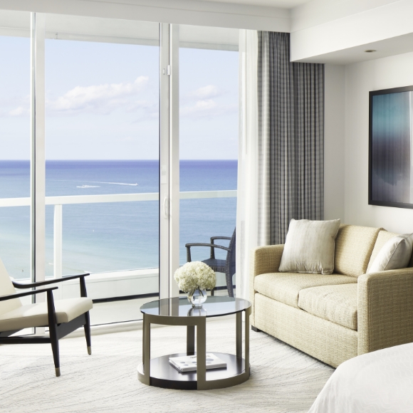 Discover ultimate luxury with a spacious marble bath with glass-enclosed shower. Floor-to-ceiling windows provide breathtaking, unobstructed views of the Atlantic Ocean, while the balcony overlooks our beautiful pools. Choose between king or two queen beds.