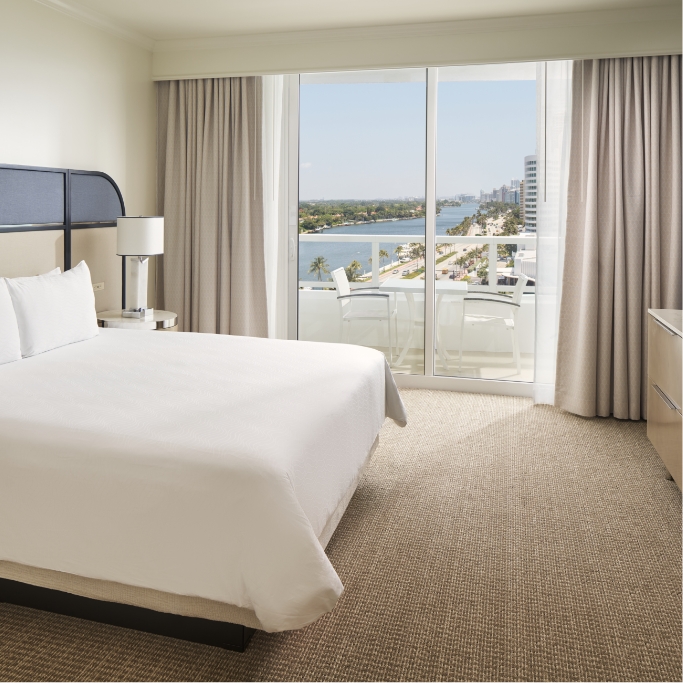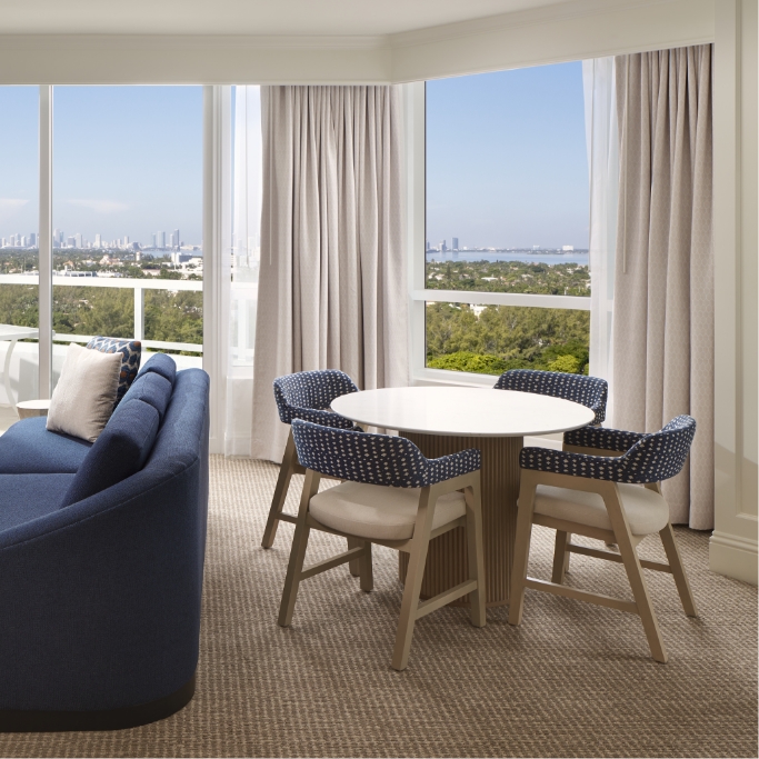 Experience a spectacular Miami Beach suite overlooking the twinkling lights of downtown or shimmering Biscayne Bay. Enjoy a spacious 1,000 square feet including a full-size kitchen with premium appliances and a washer/dryer plus a second full bath. Your bedroom features a luxurious bathroom with both a tub and walk-in shower.