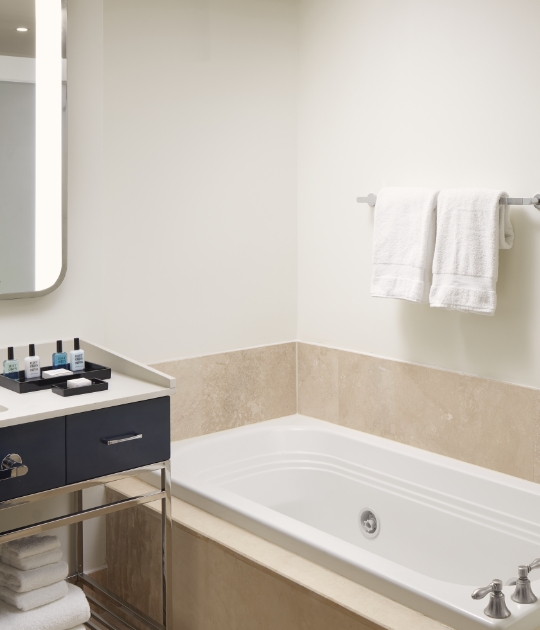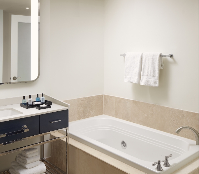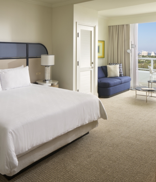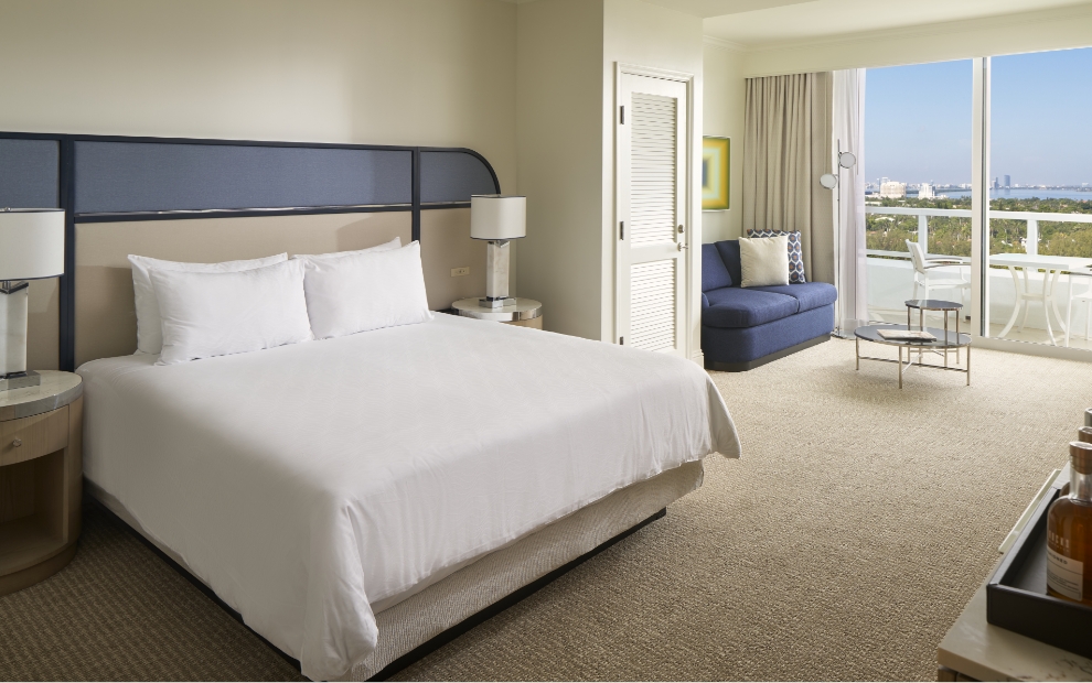 Make yourself at home in your spacious suite at Trésor Tower, our 37-story high-rise with breathtaking balcony views of Biscayne Bay or Downtown Miami. Each suite offers convenient amenities for extended stays, including a sitting area with full-size sleeper sofa, and kitchenette with mini refrigerator, sink and microwave.